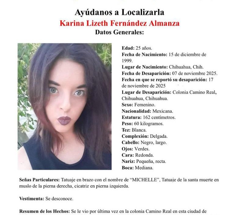 Piden ayuda para encontrar a Karina, fue vista por última ocasión en Camino Real 17 noviembre, 2025 No hay comentarios Leer más