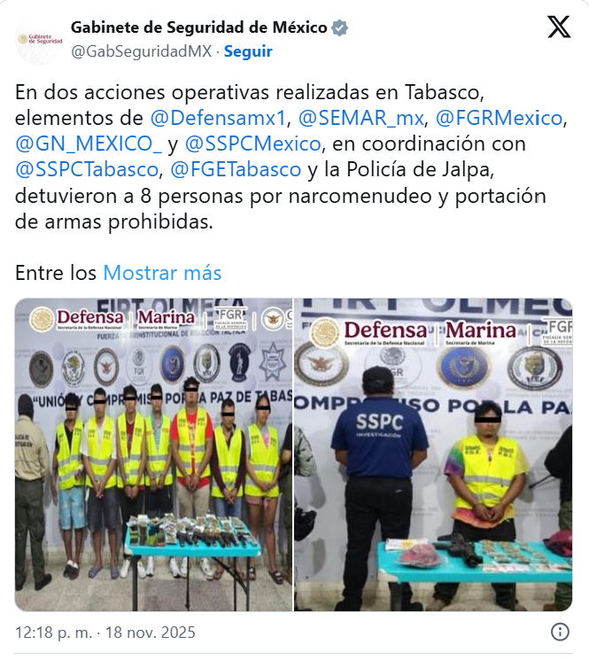 Detienen a ocho presuntos delincuentes y decomisan armas y droga en Tabasco 18 noviembre, 2025 No hay comentarios Leer más