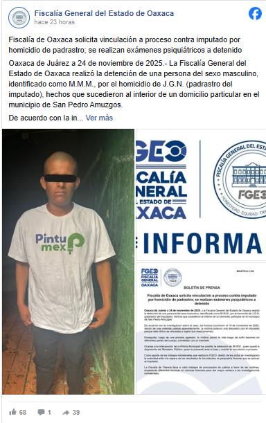 La policía estatal y la Guardia Nacional (GN) realizaron la detención del implicado en el crimen identificado como M.M.M., por el homicidio de J.G.N. (padre del imputado), hechos que sucedieron al interior de un domicilio particular en el municipio de San Pedro Amuzgos.