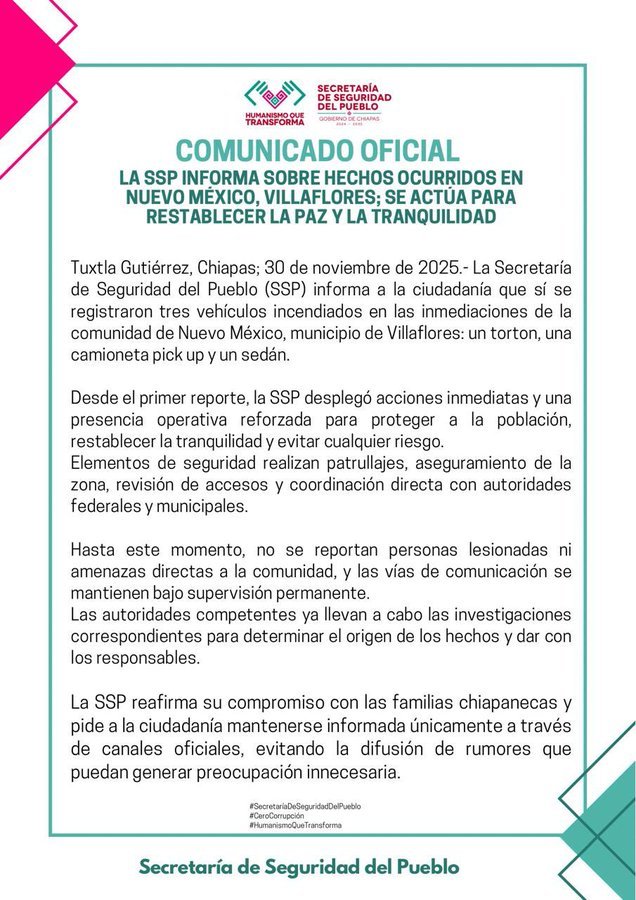 La Secretaría del Pueblo confirmó la quema de tres vehículos en la comunidad de Nuevo México: un torton, una camioneta tipo pick-up y un sedán. Informaron que se desplegaron elementos de seguridad en la zona y que hasta el momento no se han reportado personas lesionadas ni detenidas.