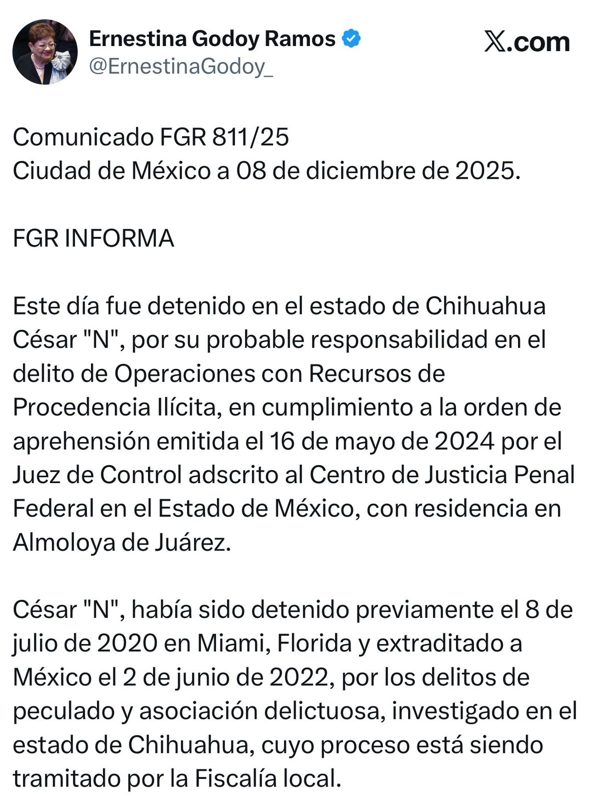 La detención se llevó a cabo en el estado de Chihuahua, en cumplimiento a una orden emitida por un juez federal con sede en Almoloya de Juárez, Estado de México, el pasado 16 de mayo de 2024.