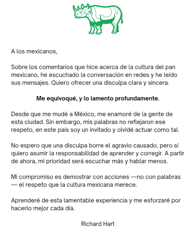 Hart aseguró que desde su llegada a México se ha enamorado de la ciudad y de su gente, pero reconoció que sus palabras no reflejaron ese respeto: “En este país soy un invitado y olvidé actuar como tal. No espero que una disculpa borre el agravio causado, pero sí quiero asumir la responsabilidad de aprender y corregir”.