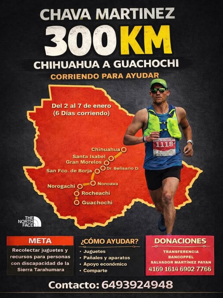 H. Cd de Chihuahua.- Del 2 al 7 de enero, el corredor Chava Martínez realizará un reto de 300 kilómetros, desde la ciudad de Chihuahua hasta Guachochi, con el objetivo de recolectar juguetes y recursos económicos para apoyar a personas con discapacidad de la Sierra Tarahumara.