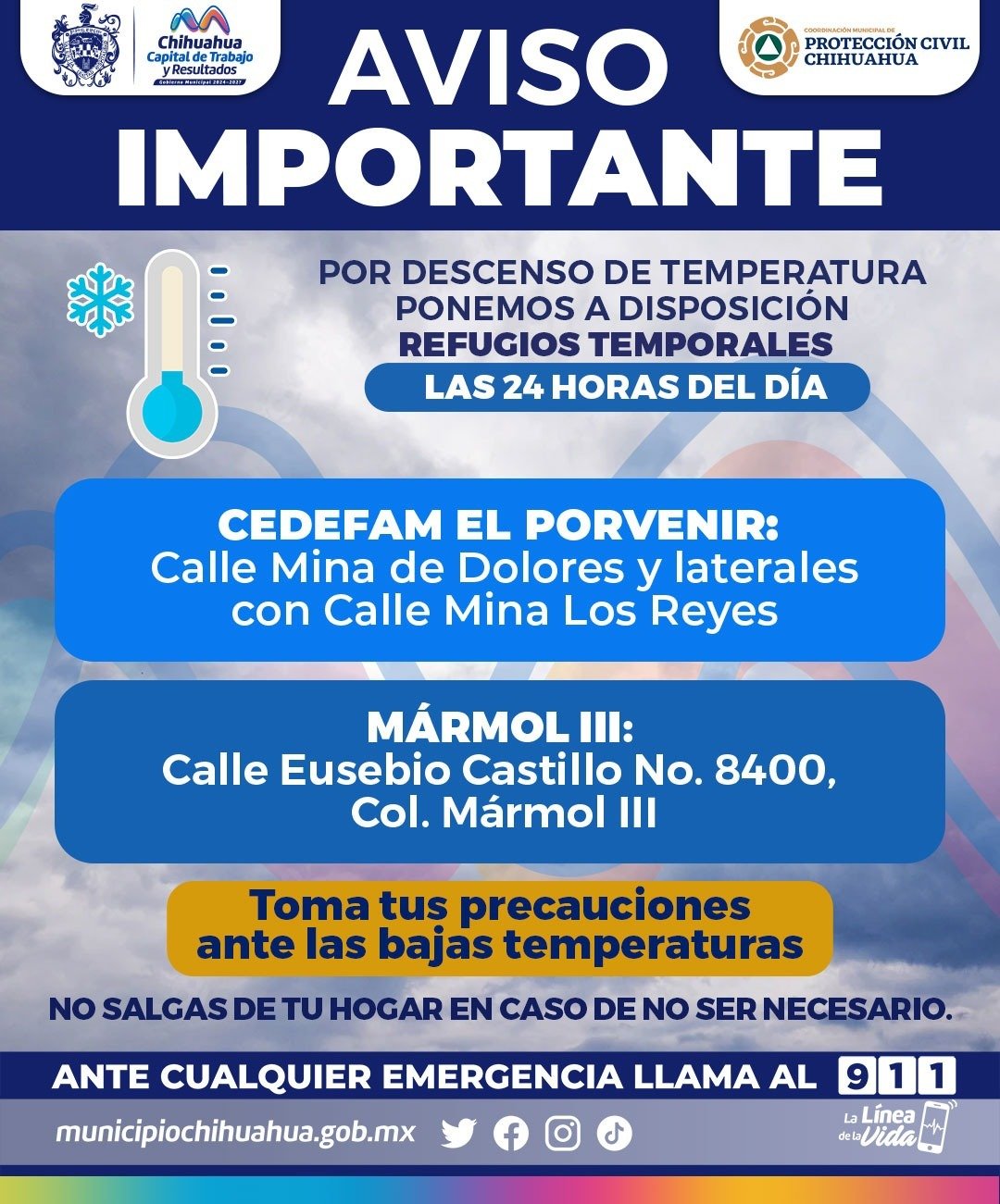 H. Cd de Chihuahua.- La Coordinación Estatal y Municipal de Protección Civil emitieron una alerta preventiva ante el pronóstico de bajas temperaturas que se registrarán del viernes 9 al domingo 11 de enero. Se prevén mínimas de hasta -6°C en zonas serranas como Temósachic, El Vergel, Madera y Creel, mientras que otros municipios podrían registrar temperaturas bajo cero, como Cuauhtémoc, Janos y Guachochi.