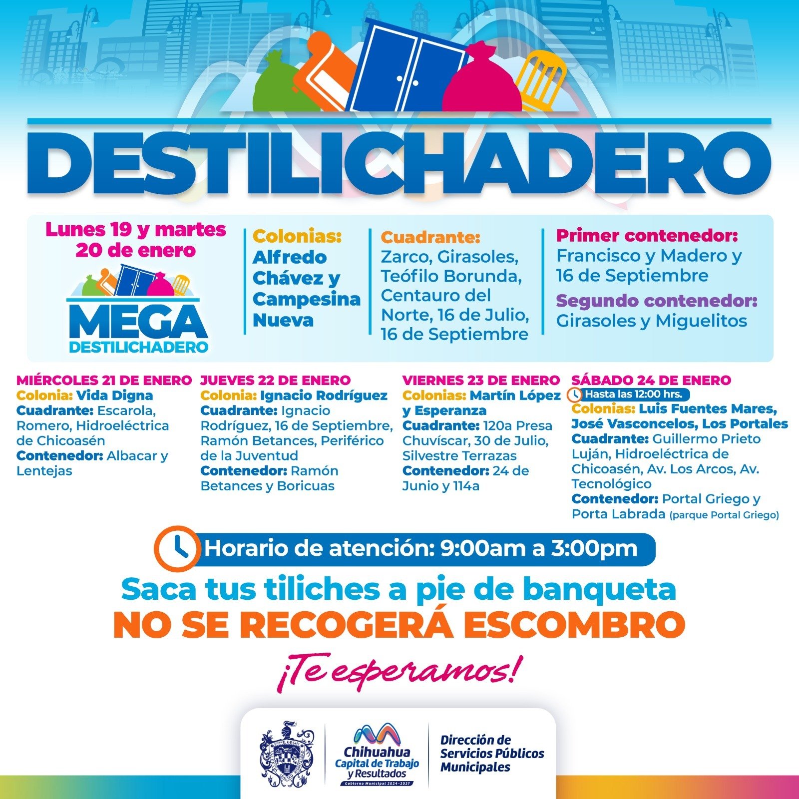 Para evitar acumulación de basura grande y posibles focos de infección, el Gobierno Municipal anunció que el programa Destilichadero recorrerá nueve colonias de la ciudad del 19 al 24 de enero.