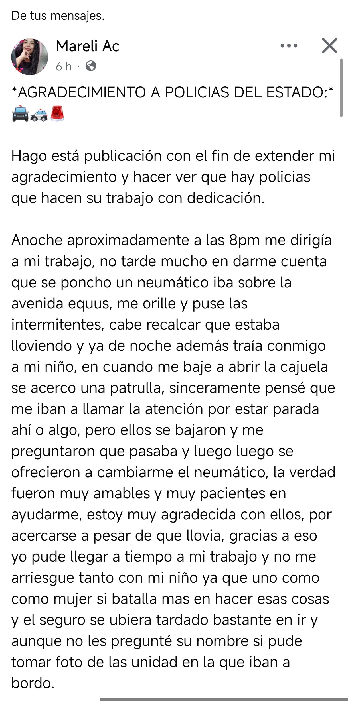 Aunque no logró conocer los nombres de los agentes, compartió imágenes de la unidad policial y manifestó su deseo de que su mensaje llegue a ellos, reconociendo que también hay policías comprometidos con ayudar a la comunidad.
