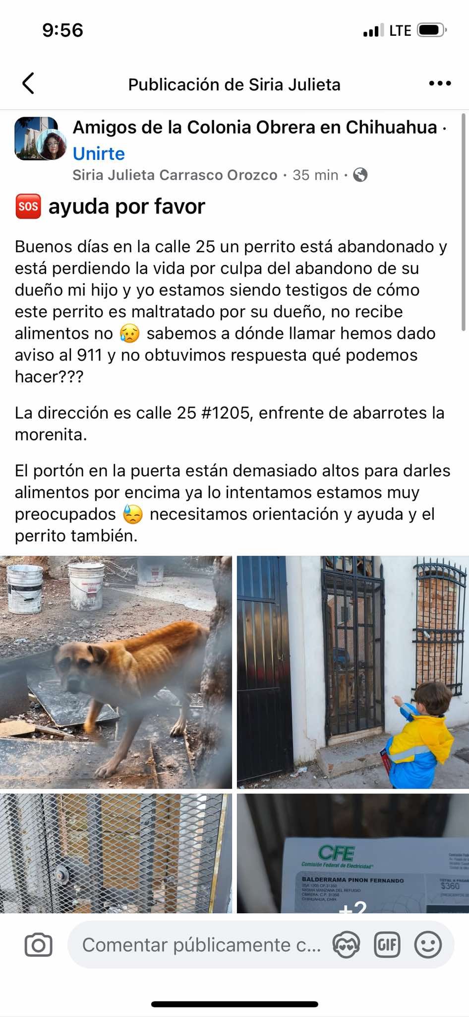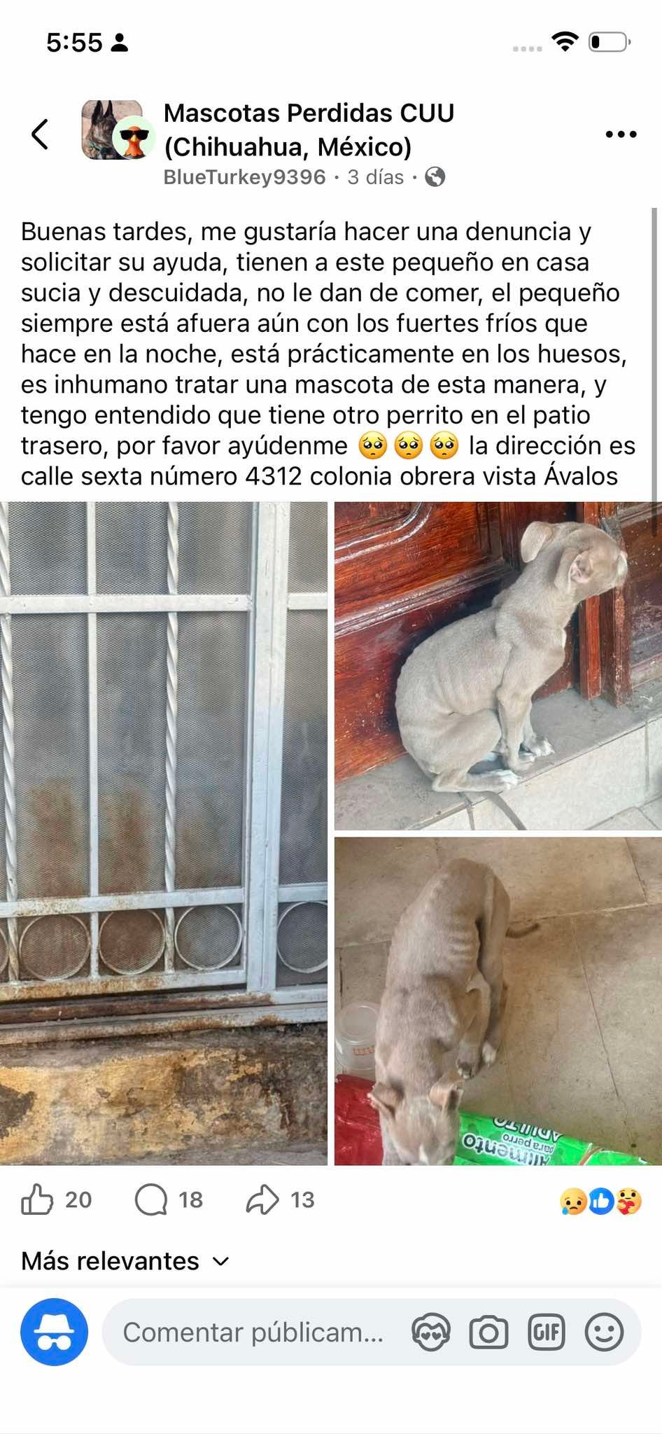 A través de redes sociales, denunciaron que uno de los casos se encuentra en la calle 25 #1205, frente a Abarrotes La Morenita, donde un perro luce extremadamente delgado y sin recibir alimento. Señalan que ya llamaron al 911, pero no obtuvieron respuesta.