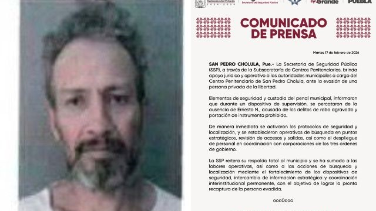 H. Cd de Chihuahua.- Un interno identificado como Ernesto “N”, acusado de robo agravado y portación de instrumento prohibido, se fugó el lunes 16 de febrero del Centro Penitenciario de San Pedro Cholula, en Puebla. La ausencia del reo se detectó durante el pase de lista rutinario, cuando el personal penitenciario confirmó que no se encontraba en el área asignada.