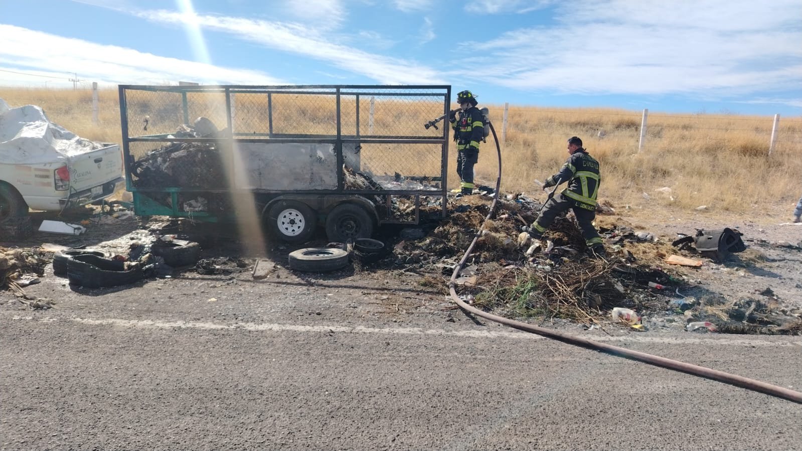 H. Cd de Chihuahua.- Una trailera de la empresa Catalina que transportaba basura rumbo al relleno sanitario se incendió luego de permanecer varada desde el día anterior en el cruce de la carretera Panamericana y la vía libre, a la altura de las Curvas del Perico.
