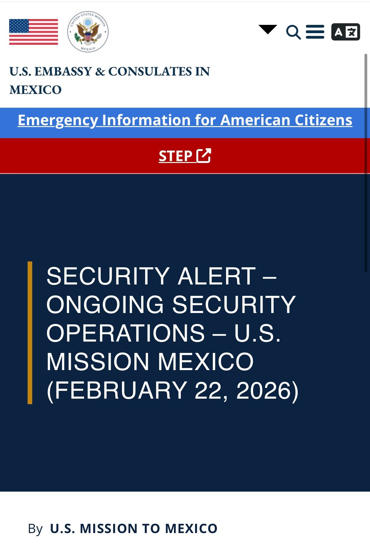 El aviso, identificado como “Alerta de Seguridad – Operaciones de Seguridad en Curso – Misión Diplomática de los Estados Unidos en México (22 de febrero de 2026)”, señala que, debido a los operativos y a la actividad delictiva derivada de estos, las personas en las localidades mencionadas deben permanecer en sus hogares hasta nuevo aviso.