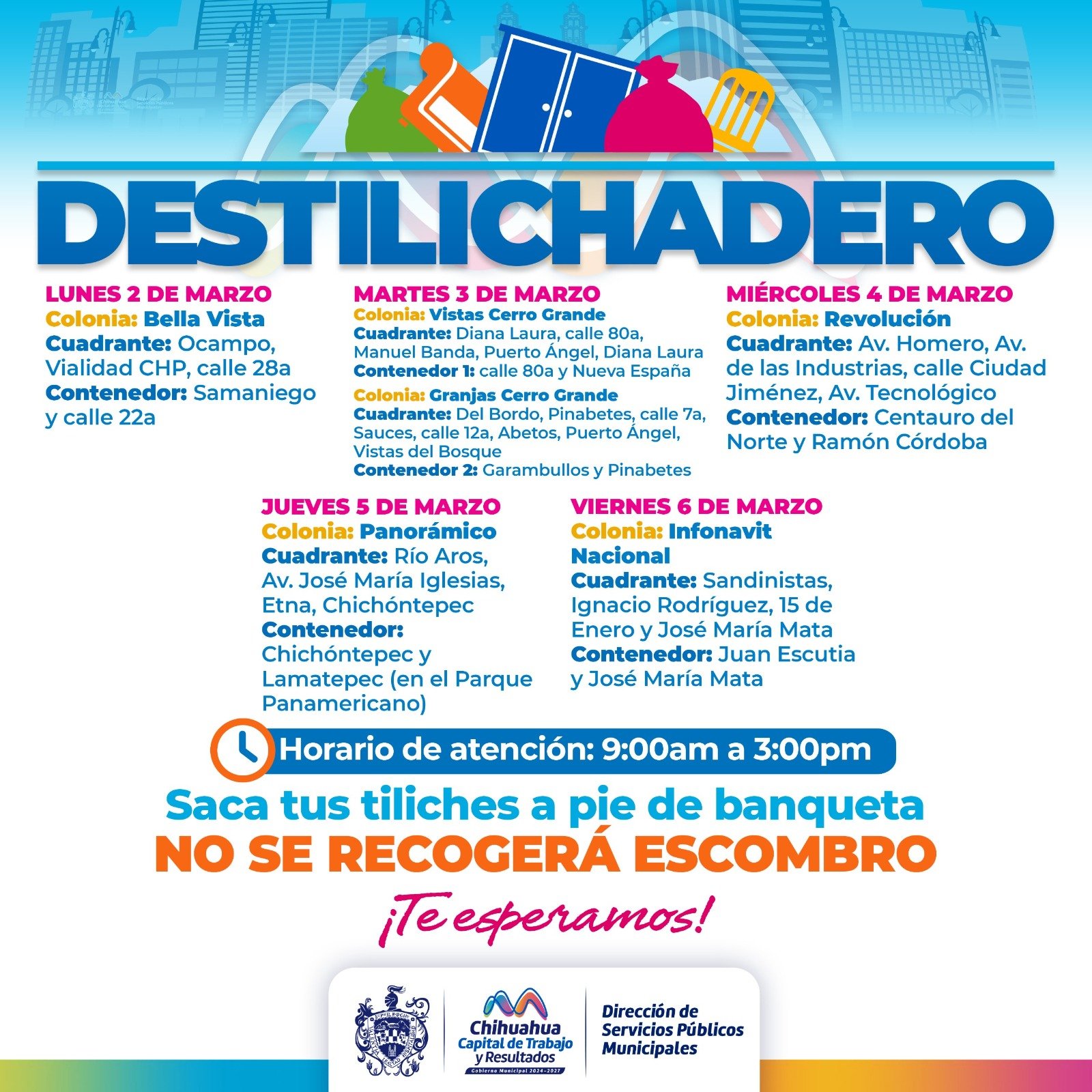 H. Ciudad de Chihuahua, Chih.– Con el objetivo de evitar acumulación de objetos voluminosos en los hogares que puedan generar focos de infección o plagas, el Gobierno Municipal, a través de la Dirección de Servicios Públicos Municipales, dio a conocer el calendario del programa Destilichadero, que se llevará a cabo del 2 al 6 de marzo en seis colonias de la capital.