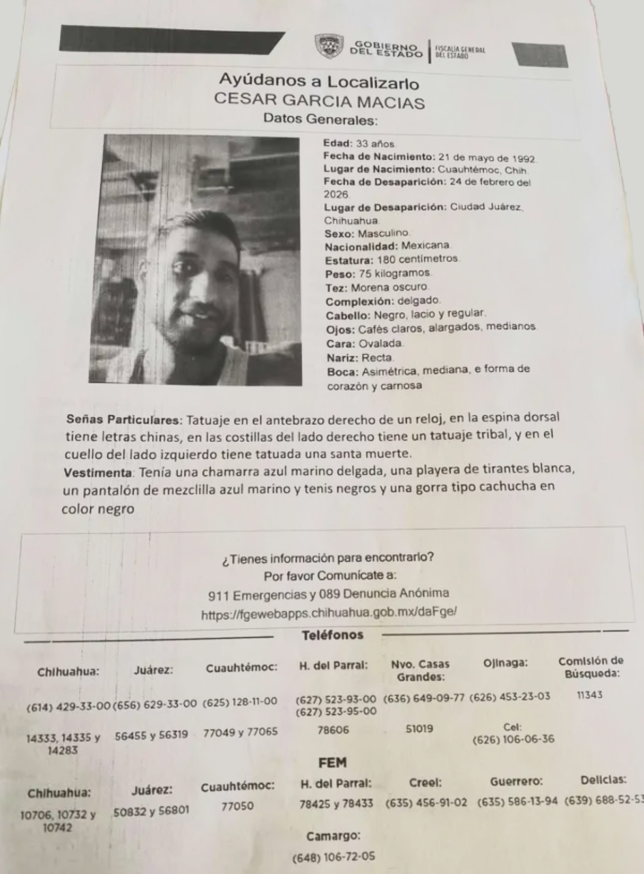 Ciudad Juárez.- La Fiscalía General del Estado (FGE) emitió una pesquisa para localizar a César García Macías, de 33 años, quien fue visto por última vez el 24 de febrero en esta ciudad.
