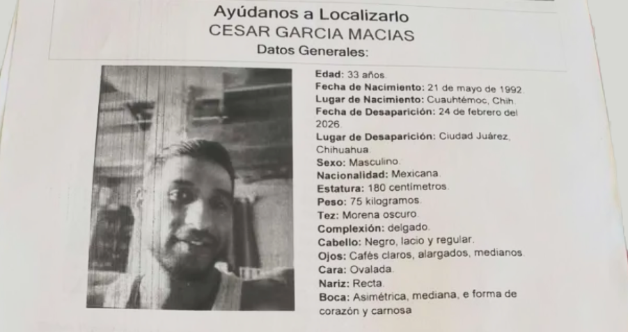 Ciudad Juárez.- La Fiscalía General del Estado (FGE) emitió una pesquisa para localizar a César García Macías, de 33 años, quien fue visto por última vez el 24 de febrero en esta ciudad.