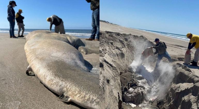 Para evitar riesgos sanitarios, malos olores y la proliferación de fauna nociva, las autoridades optaron por enterrar el cuerpo en el mismo lugar. Con apoyo de maquinaria pesada, se excavó una fosa donde la ballena fue cubierta con cal y arena, permitiendo su descomposición natural sin afectar el equilibrio del ecosistema. (En Blanco y Negro).
