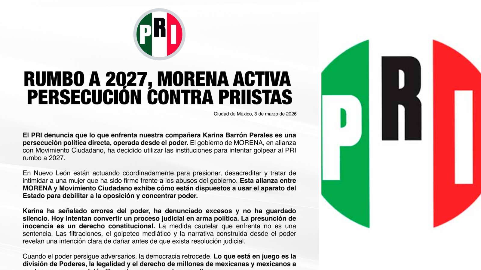 H. Cd de Chihuahua.- El PRI acusó a Morena y Movimiento Ciudadano de usar la justicia con fines políticos tras la detención de Karina Barrón Perales, exsecretaria de Desarrollo Humano e Igualdad Sustantiva en Monterrey. Según el PRI, la aprehensión, ocurrida el 2 de marzo, forma parte de una estrategia para presionar e intimidar a la oposición en el contexto previo al proceso electoral de 2027.