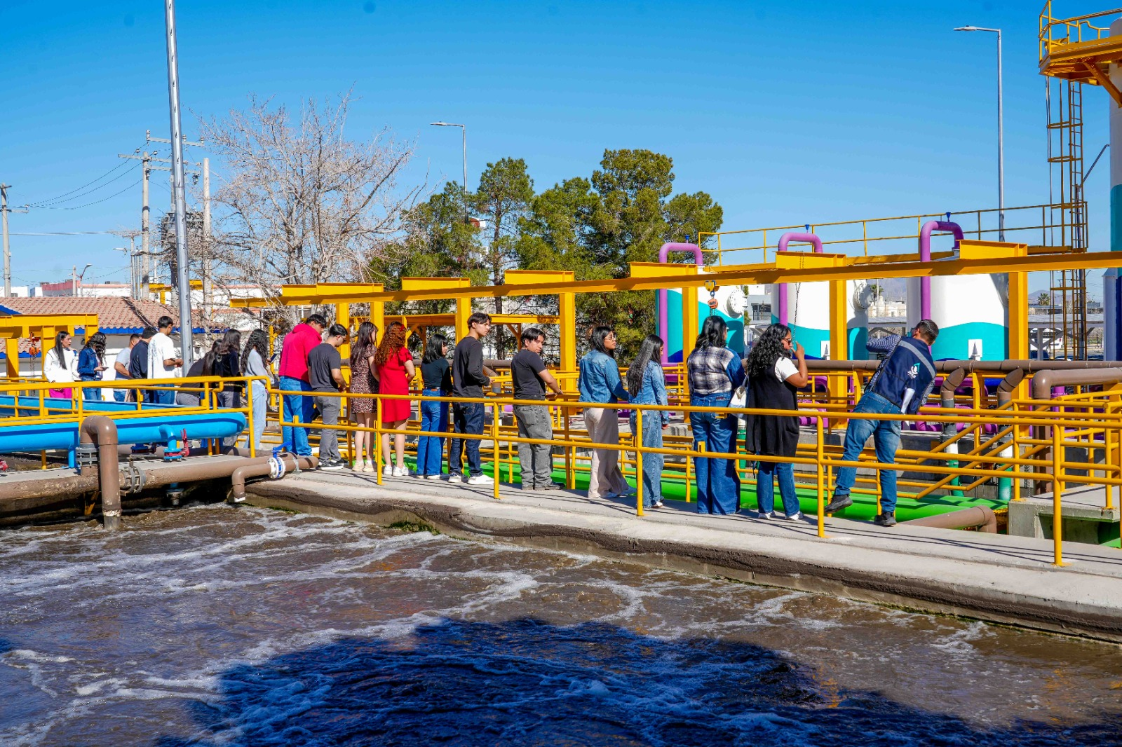 Durante el recorrido, alumnos de la materia de Gestión Ambiental observaron cada etapa del proceso que sigue el agua residual. Personal técnico explicó cómo la planta recibe el líquido, lo somete a distintas fases de tratamiento y lo canaliza para su reutilización en la ciudad.