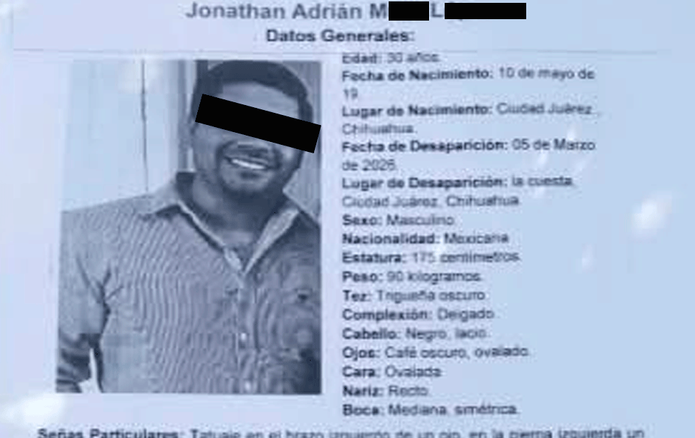 Ciudad Juárez.- Familiares de Jonathan Adrián M. L., de 30 años, confirmaron que fue localizado sin vida luego de permanecer varios dĂas en calidad de desaparecido en Ciudad Juárez.