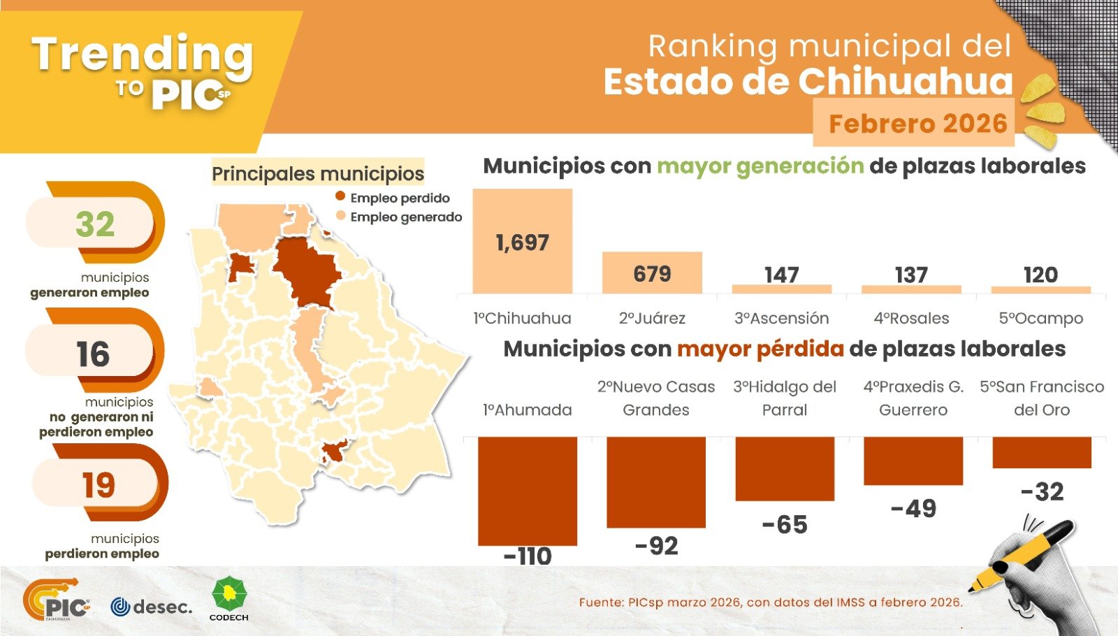 El municipio con mayor generación de empleo fue Chihuahua con 4 mil 360 puestos, seguido de Cuauhtémoc con 835 y Ciudad Juárez con 681. En contraste, los municipios con más pérdida de empleos fueron Ahumada, Jiménez y Parral.