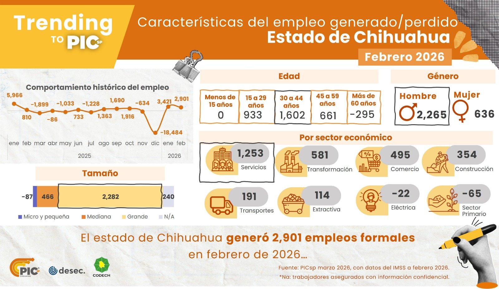H. Cd de Chihuahua.- Durante febrero de 2026 se generaron 2,901 nuevos empleos en el estado de Chihuahua, mientras que en el acumulado de enero y febrero ya suman 6 mil 322 plazas laborales, de acuerdo con datos difundidos por Dulce GarcĂa GarcĂa.