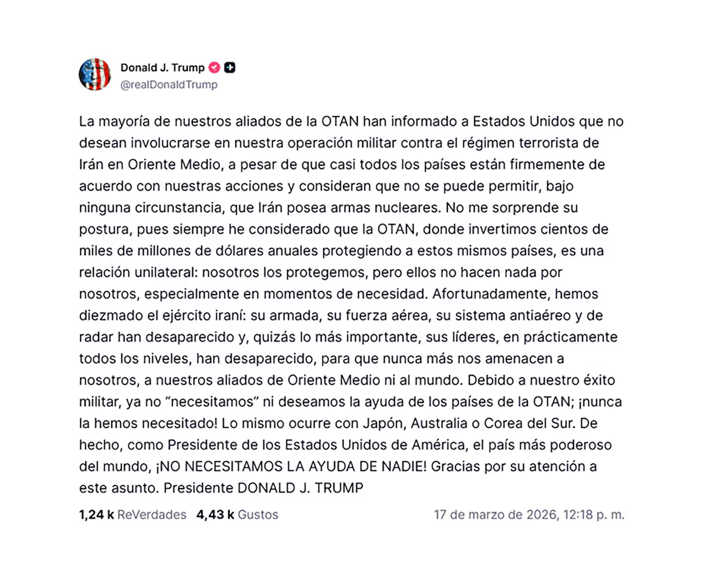 El presidente de Estados Unidos, Donald Trump, afirmó que su país no necesita el respaldo de la OTAN para continuar con la campaña militar conjunta con Israel contra Irán, luego de que varios aliados rechazaran involucrarse en el conflicto.