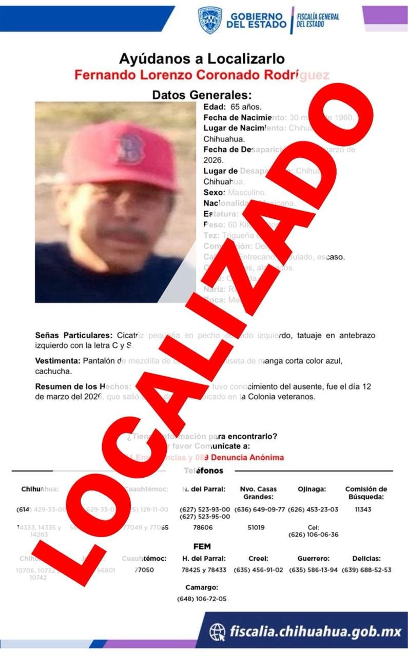 H. Cd de Chihuahua.- La Unidad de Investigación de Personas Ausentes y/o No Localizadas de la Fiscalía de Distrito Zona Centro (FDZC) encontró sanos y salvos a Fernando Lorenzo C. R., de 65 años de edad, y a Aldo Alan O. D., de 30 años de edad, quienes tenían reporte de ausencia interpuesto en la ciudad de Chihuahua.