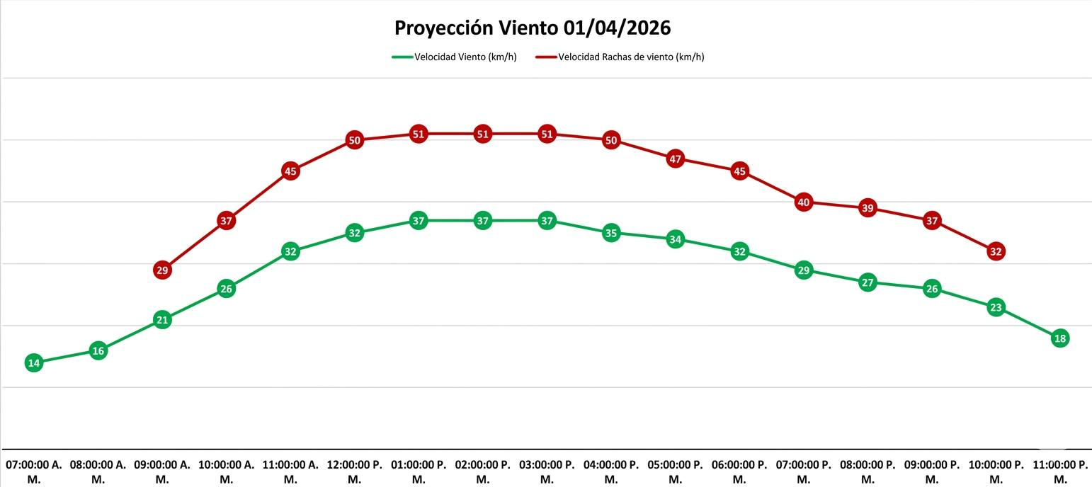 De acuerdo con el pronóstico oficial, el periodo de mayor intensidad se presentará entre las 12:00 del mediodía y las 4:00 de la tarde. Las condiciones podrían generar tolvaneras, presencia de polvo suspendido y reducción de la visibilidad en distintos sectores de la ciudad.