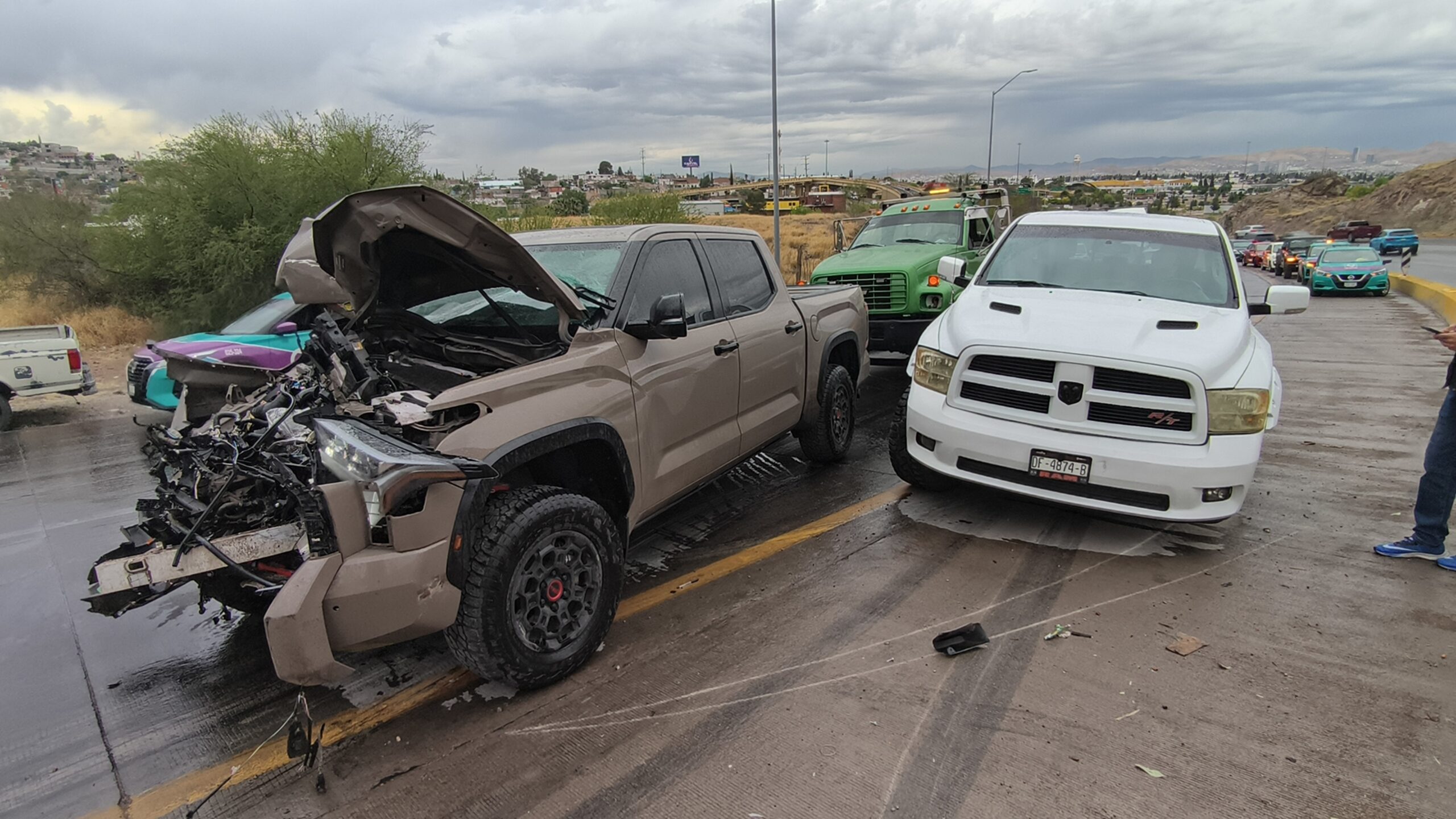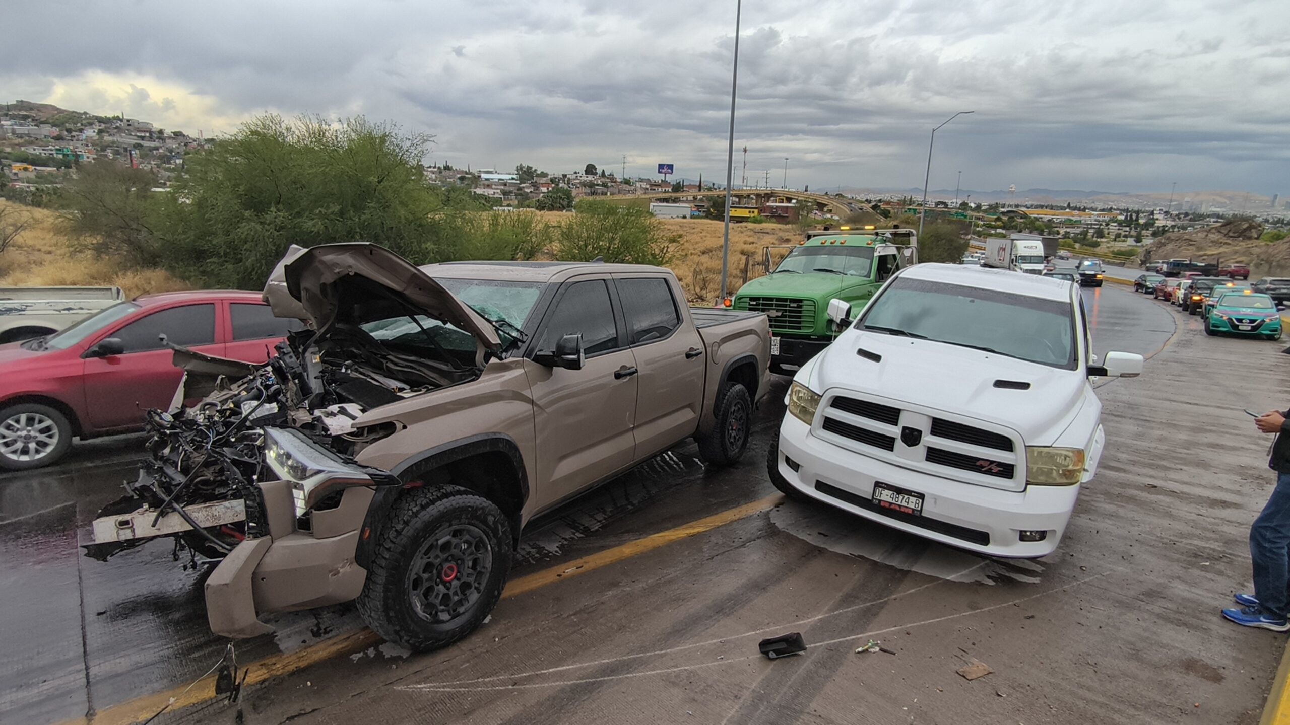 Tras el primer choque, una troca Ford Lobo color café se estrelló contra la grúa, quedando con severos daños en la parte frontal; posteriormente, una camioneta Dodge también se vio involucrada luego de que aparentemente se le desprendiera una llanta, terminando dentro del mismo percance.