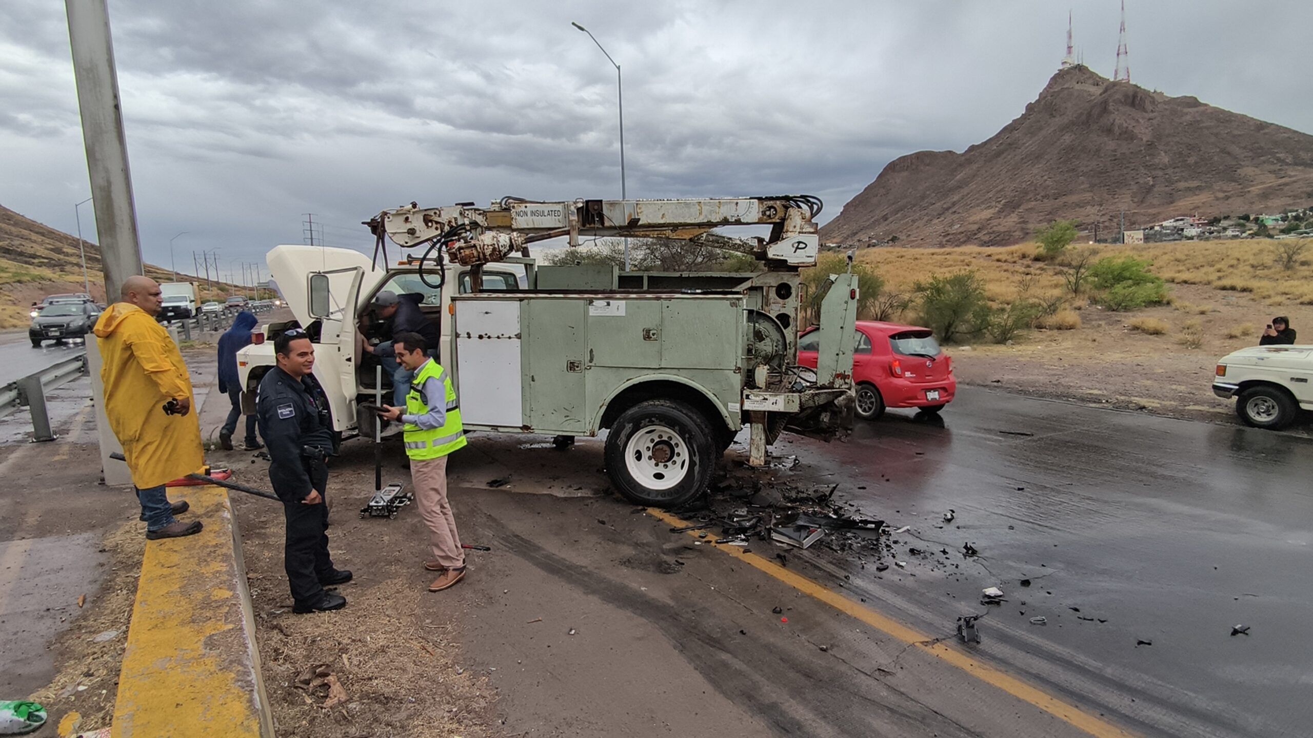 H. Cd de Chihuahua.- Un aparatoso accidente múltiple se registró en la carretera Chihuahua–Aldama, a la altura de una curva, donde una grúa perdió el control presuntamente debido al pavimento mojado y terminó impactándose contra la base de concreto de un señalamiento vial.