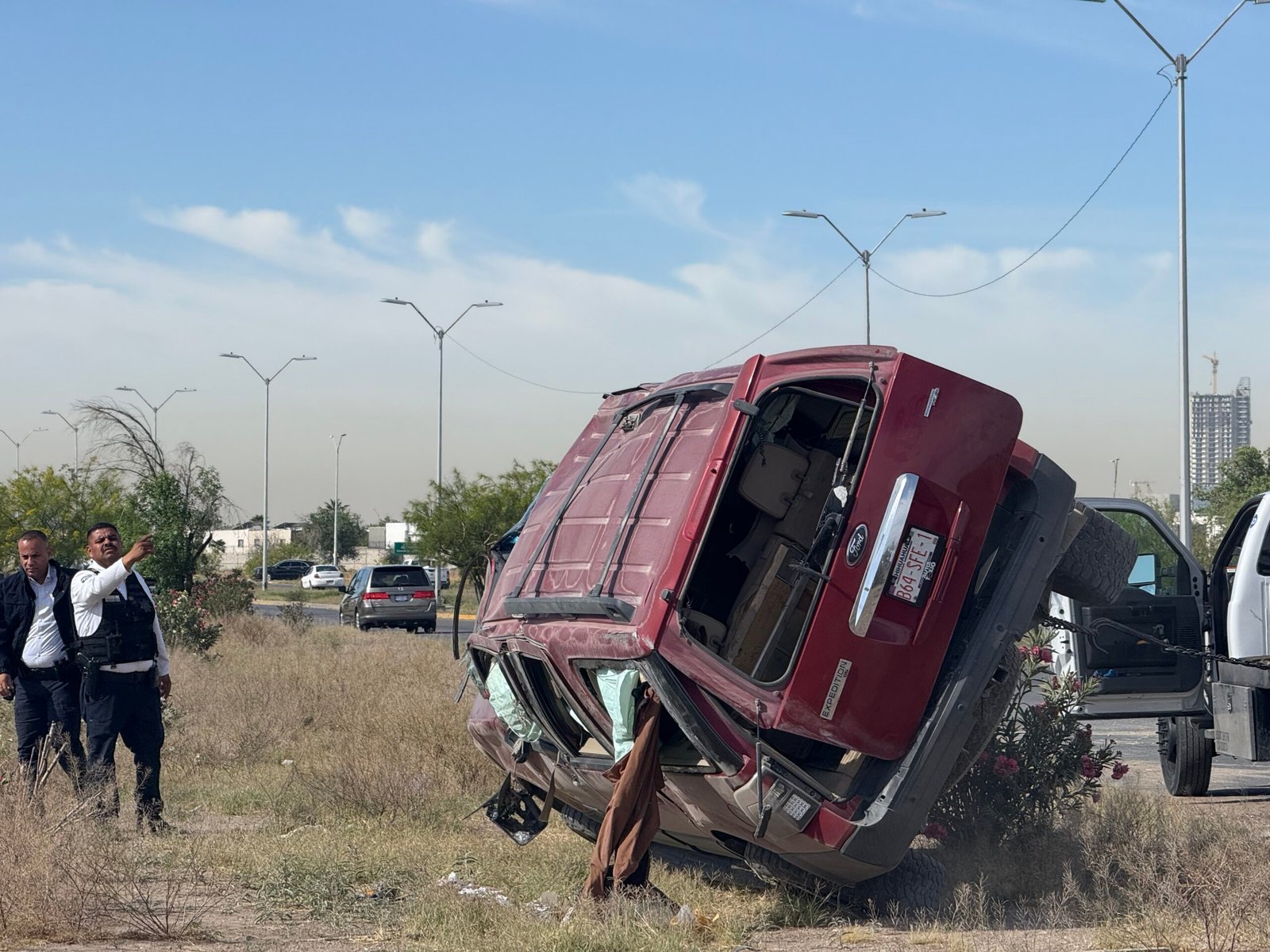 El percance se registró en el cruce con Tomás Fernández, donde la unidad, una Ford Expedition, quedó recostada sobre uno de sus costados tras perder estabilidad en la vialidad. La escena generó la presencia de autoridades y personal de auxilio para atender la situación.