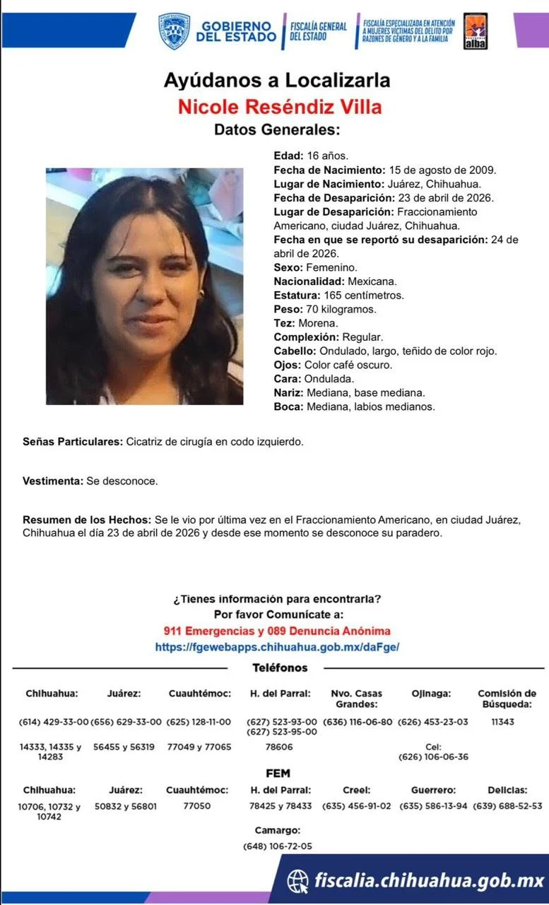 Ciudad Juárez.- La Fiscalía General del Estado activó una pesquisa para localizar a Nicole Reséndiz Villa, de 16 años, quien fue vista por última vez el 23 de abril en el fraccionamiento Americano, en Ciudad Juárez. Desde entonces, no existe información confirmada sobre su ubicación, por lo que la autoridad pidió apoyo de la comunidad para aportar cualquier dato que ayude a encontrarla.