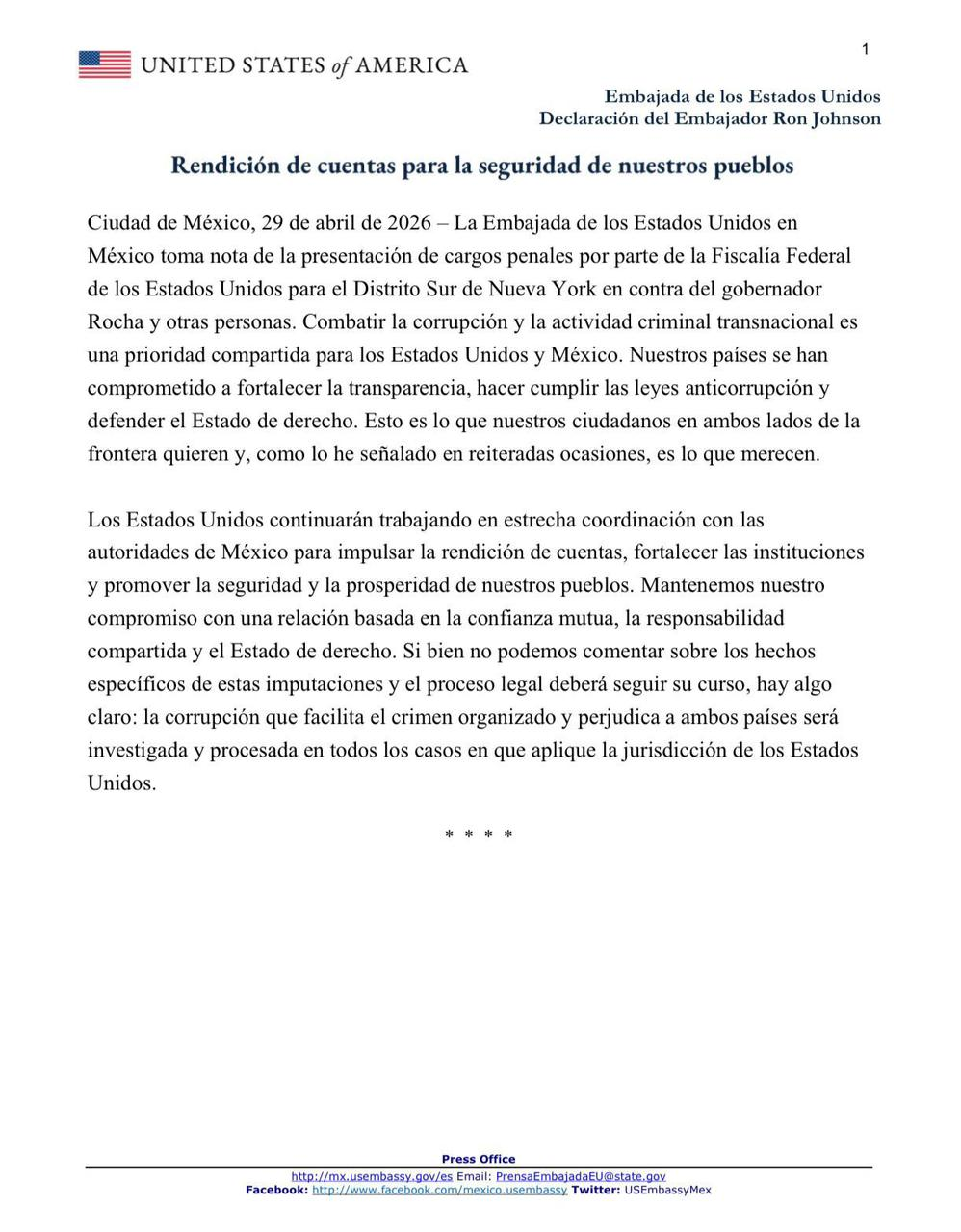 Rocha rechazó los señalamientos y afirmó que carecen de sustento. También sostuvo que las imputaciones constituyen un ataque contra Morena y contra la Cuarta Transformación. En paralelo, la embajada de Estados Unidos en México difundió una declaración donde insistió en fortalecer la rendición de cuentas, la transparencia y el Estado de derecho en ambos lados de la frontera.