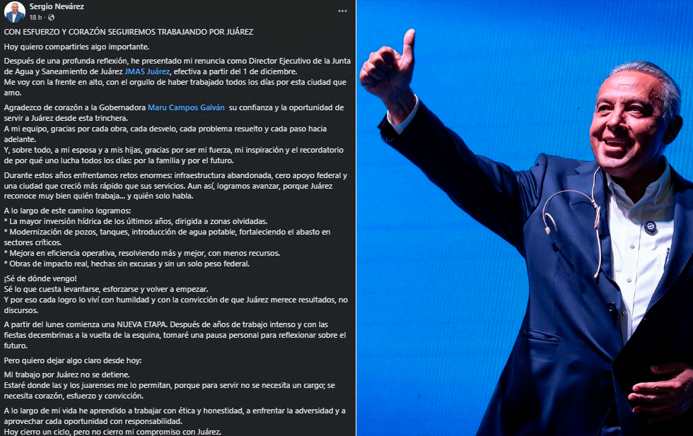 Nevárez destaca logros en la JMAS y anuncia pausa: “Mi compromiso con Juárez sigue” 27 noviembre, 2025 No hay comentarios Leer más